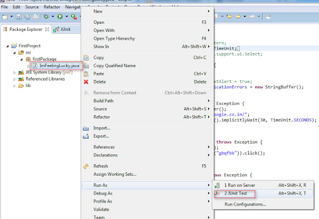 1. In Eclipse IDE, right click on the 'ImFeelingLucky' class and select 'Run As' -> 'JUnit Test' as shown below: